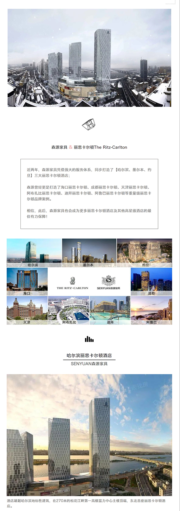 近兩年,森源家具憑借強大的服務體系,同步打造了【哈爾濱、墨爾本、約旦】三大麗思卡爾頓酒店;